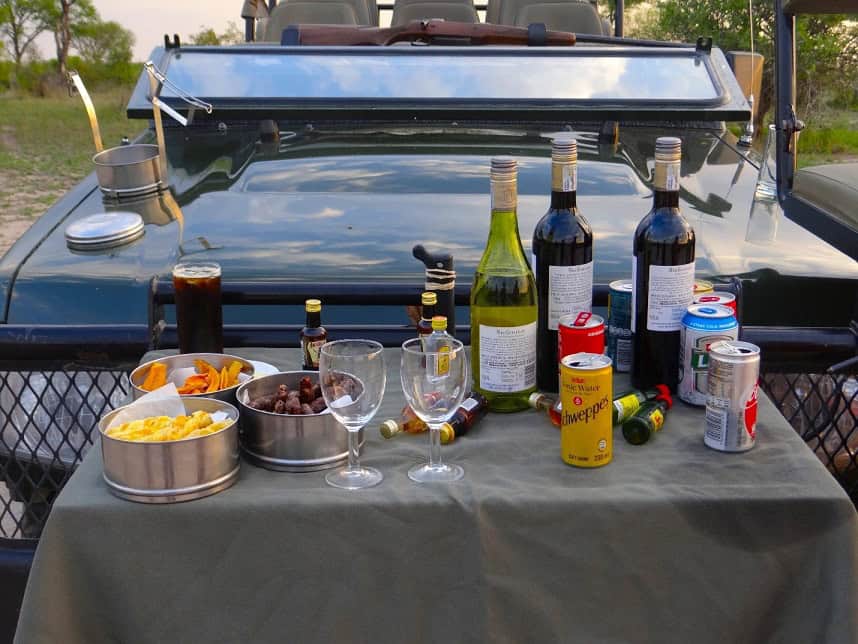 Now, during each evening game drive, you’ll also get to enjoy what’s known as “Sundowners”. As the sun is setting, your guide and ranger will find a beautiful spot, park the jeep, and set up cocktails and hors d’eouvres for you to enjoy. It is absolutely unforgettable to get your buzz on in the middle of the African tundra.