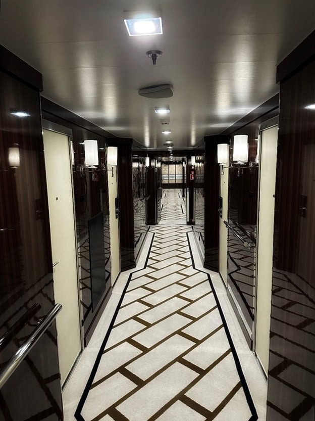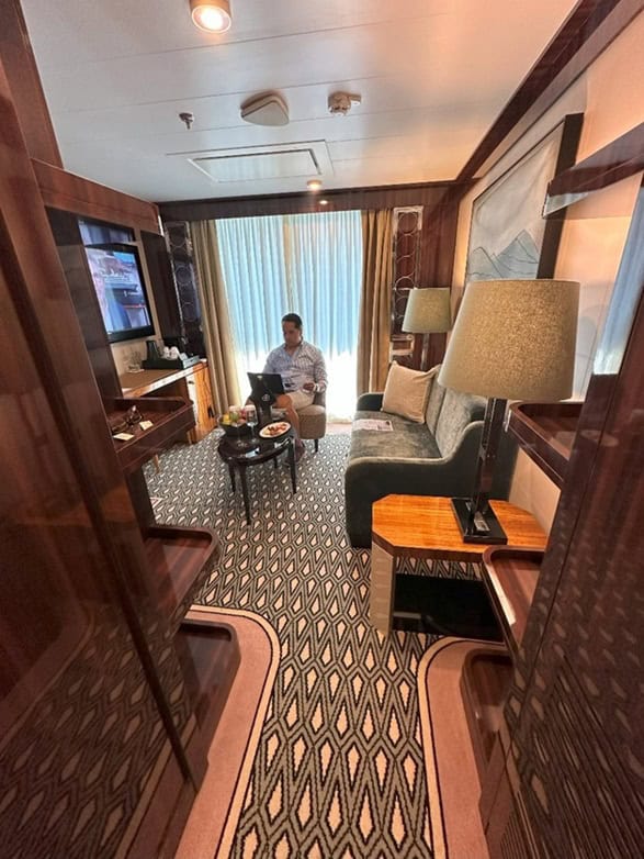 We had gotten a Journey Suite, which is a two-room affair that features a separate living room, mostly because we feared one or the both of us would have to do some work on this trip and we needed a separate space for Teams calls. It worked well in that regard, although the living room is small. (It does feature an entryway with cabinets that offer lots of additional small storage spaces, which is handy.) We toured one of the larger suites and the living room was considerably bigger, so there are definitely options for larger spaces if you plan to entertain in your suite. (What kind of entertaining you do is up to you. I don’t judge.)