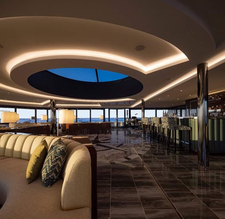 Decked out in glossy dark woods and marble, the rooms are modern glam. Larger than typical cruise cabins (which average 200 square feet), these start at 270, and they feel warm, comfortable and sophisticated. I especially liked the all-marble baths with a reasonably spacious glass shower that features multiple showerheads and L’Occitane products.