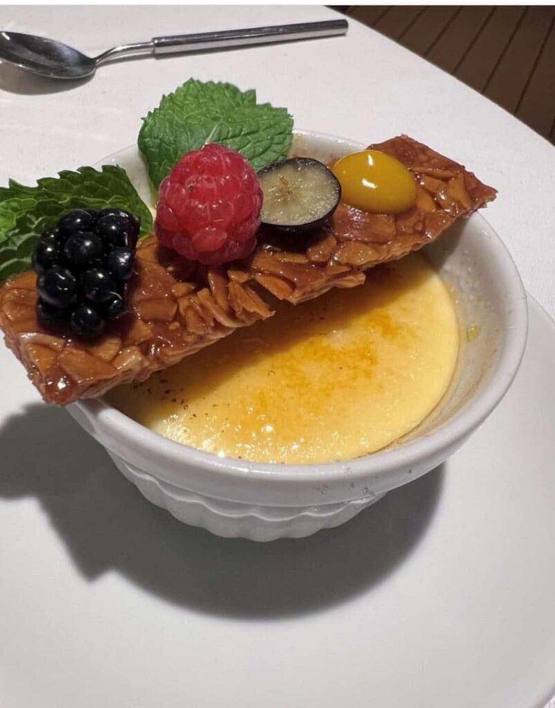 7 Aft Grill is tucked away in a corner of the pool deck, and during the day it offers the usual poolside fare, albeit tarted up for a luxury crowd. But at dinnertime, it offers a steakhouse menu (filet and lobster tail, anyone?), so although I liked the ambience of the Porto outside deck better, it’s definitely worth trying for dinner. There is no extra charge, of course, but reservations are necessary since they only serve 40 or so people a night.