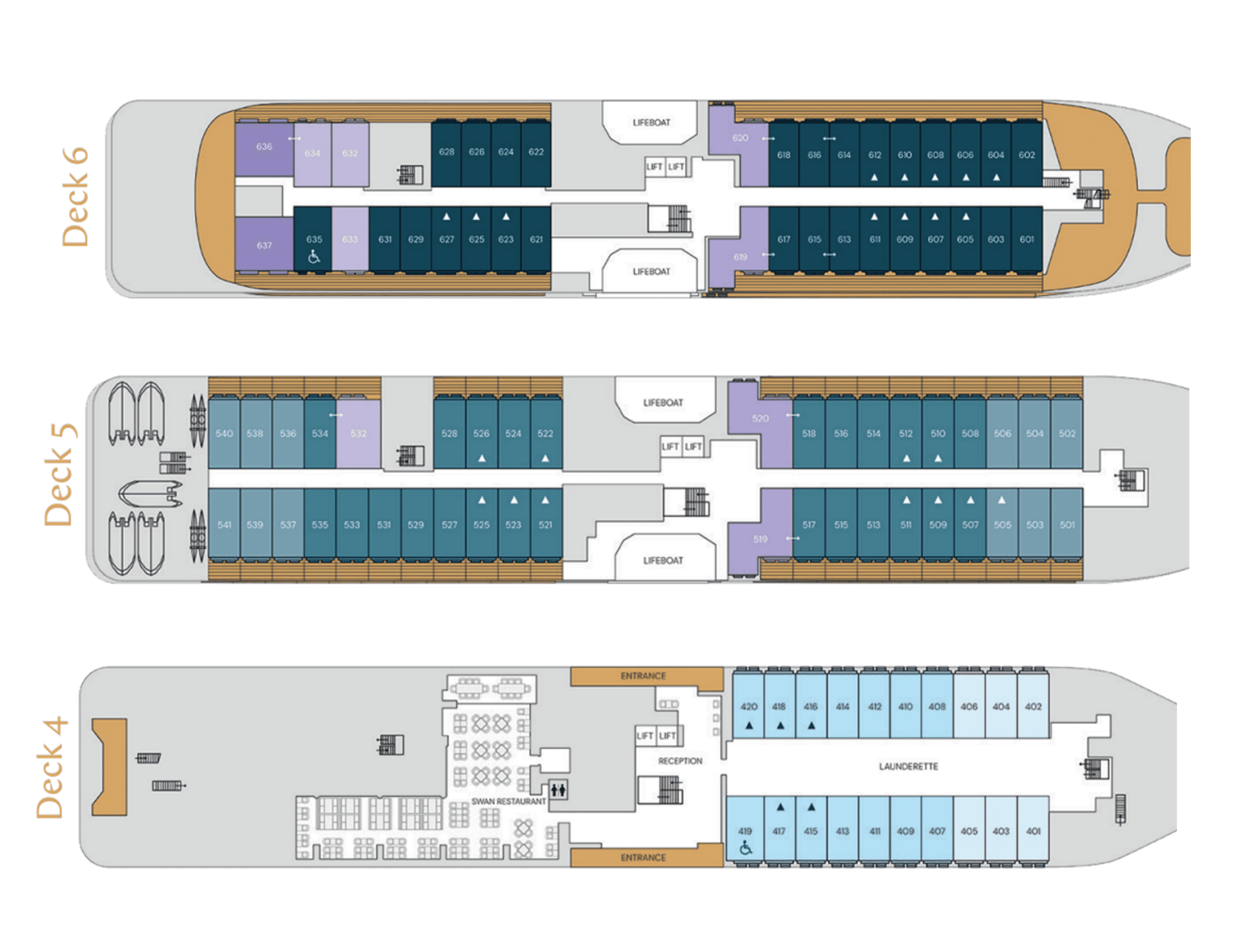 We strongly recommend that guests are able to navigate the stairs on-board without assistance. Should guests require assistance, they must travel with someone who is able to assist them both ashore and at Onboard. Brand g and Swan Hellenic are unable to offer special assistance. Please note that wheel-on and/or wheel-off access is not available at ports-of-call.