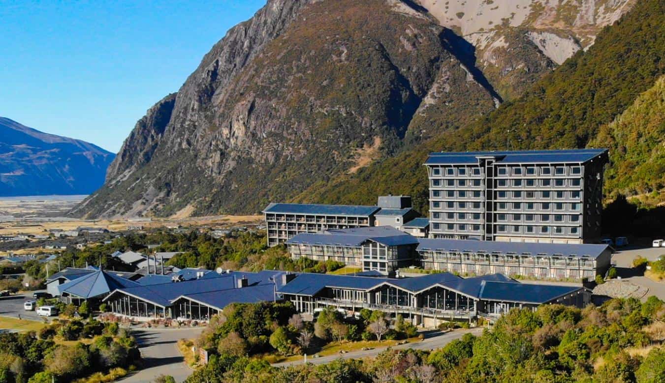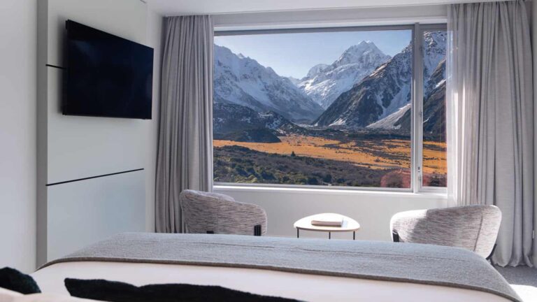 The Hermitage Hotel is an iconic property located in the heart of Aoraki Mount Cook National Park. Surrounded by dramatic alpine scenery, it offers a range of accommodation options, from well-appointed rooms to premium suites with mountain views. Guests enjoy a choice of restaurants and bars, as well as easy access to walking trails and activities in the park. Its setting makes it one of New Zealand’s most memorable stays.