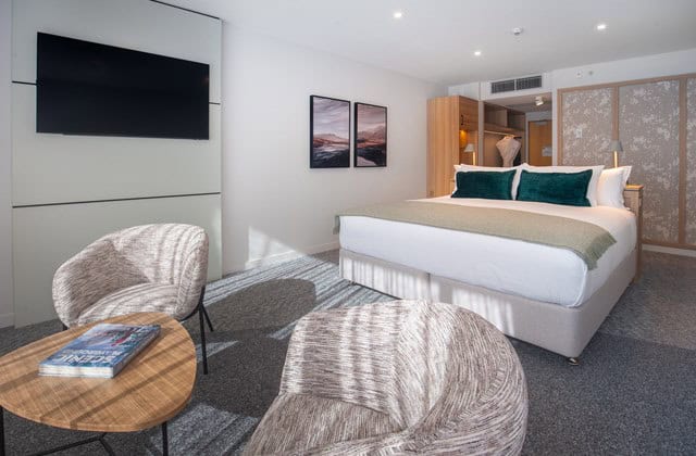 The Lake King rooms have magnificent views over the stunning Lake Wakatipu and the majestic Remarkables. Breathe in the mountain magic from your Juliet balcony and wake up to it from your luxurious king bed. Surrounded by designer comfort, the sleek bathroom comes with a standalone bath and separate shower with ALICE amenities. Opening windows provide natural delights, and your entertainment extras complete the modern comforts.